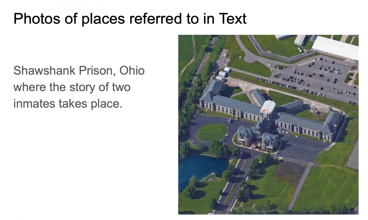 Students will first record the different places in their novel, and any other information about that place, on a Google/Powerpoint Slide document. A sample submitted by Jasmine on a novel by Stephen King is shown at right.