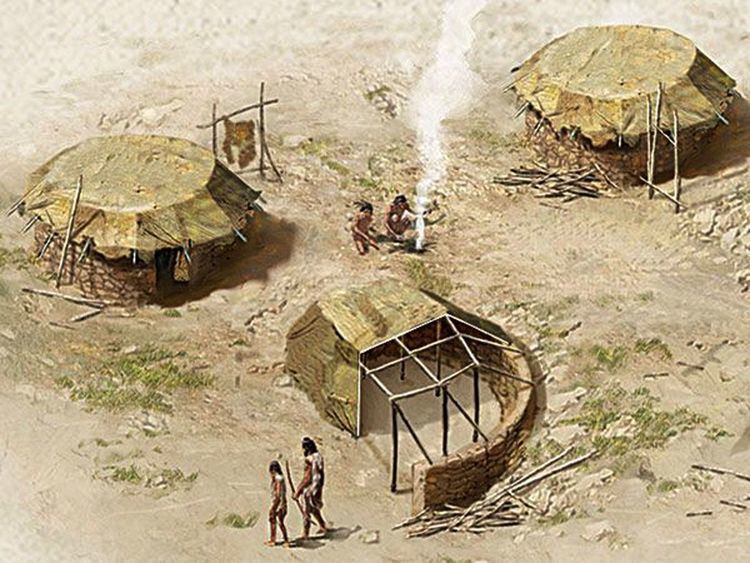 5 The first permanent village settlement of pre-agricultural times in Palestine, Kathleen Kenyon describes the material remains found there as Natufian, consisting of 50 circular, semi-subterranean, one-room huts, paved with flat slabs and surrounded by stone walls up to 1.2 meters (3.9 ft) high.